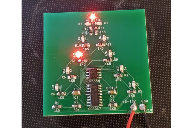 The front side contains components to make a tree with 11 blinking lights.